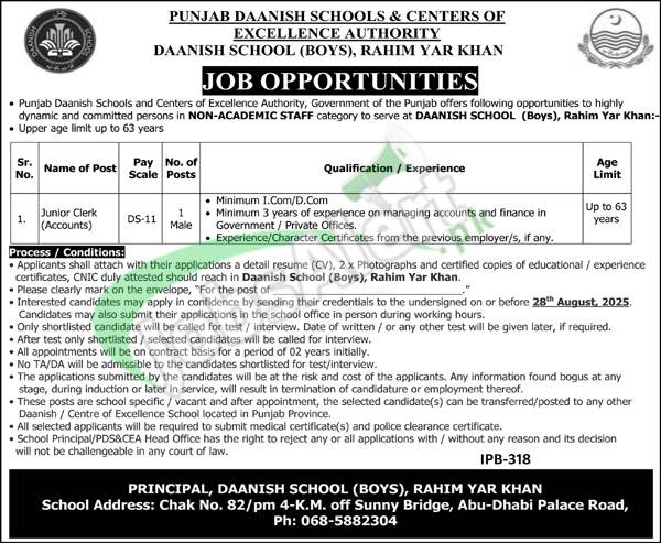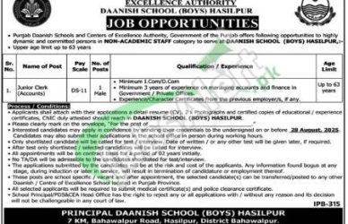 Danish School Jobs to apply in Rahim Yar Khan District are such as (Junior Clerk (Accounts)). Appointment of the above-mentioned positions will be done on a pure contract basis, and the duration of the contract is extendable on satisfactory performance.