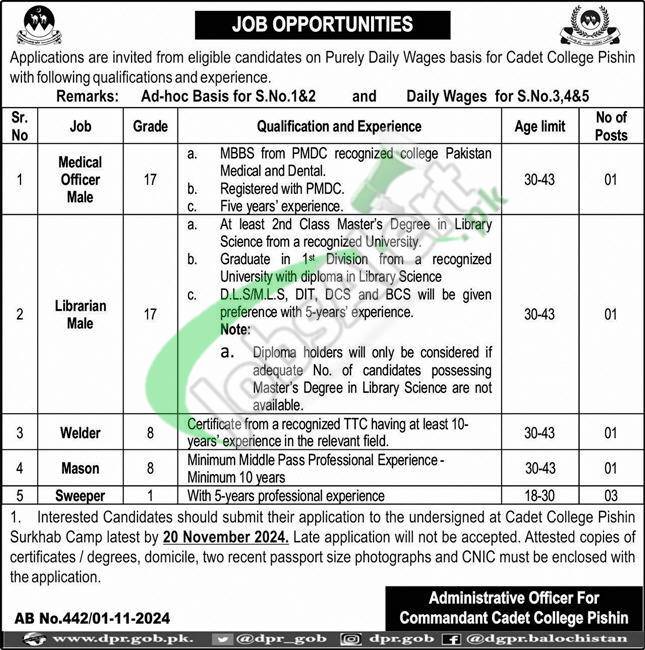 Jobs to apply in Cadet College Pishin Balochistan are such as (Medical Officer Male, Librarian Male, Welder, Mason, Sweeper) are government jobs required to be filled along with overall qualifications of MBBS / Masters / Matric / Middle with several years expertise in the relevant field is required to apply for such jobs.