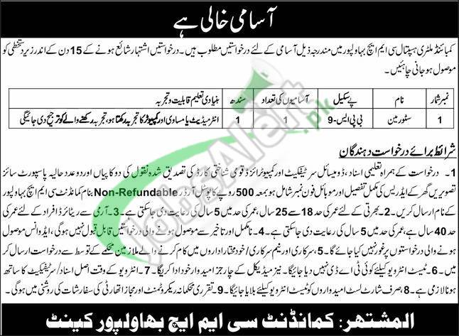 Get CMH Bahawalpur Jobs 2025 Combined Military Hospital Latest Advertisement from this page. Jobs in Pak Army CMH Combined Military Hospital Bahawalpur are available and it is looking for male and female candidates for the following CMH Jobs such as (Storeman (BPS-09)).