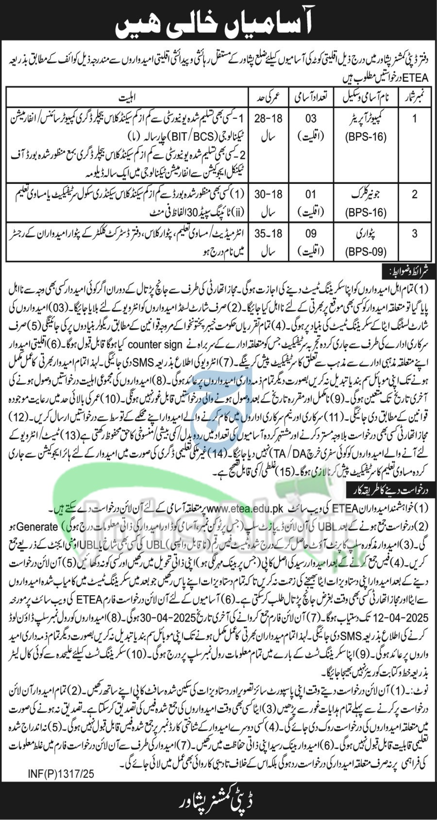 DC Office Peshawar Jobs 2025 Latest Advertisement
