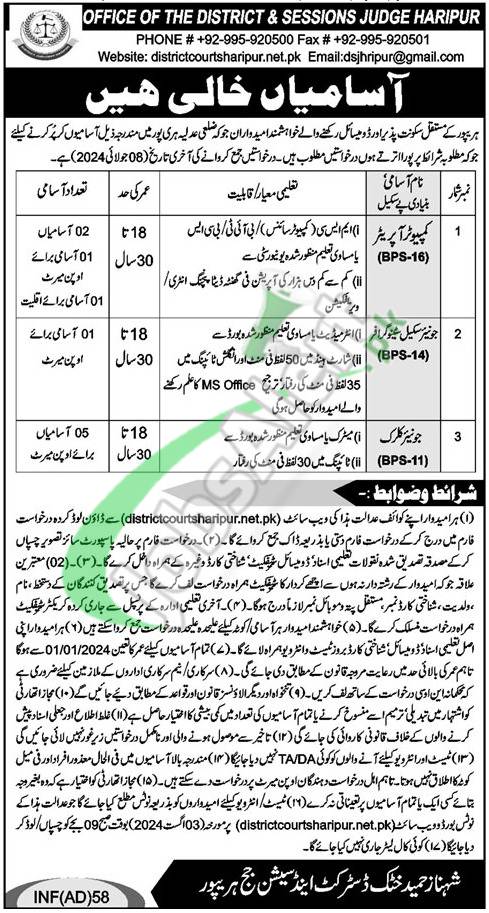 - District and Session Court Haripur Jobs last date to apply is July 08, 2024.