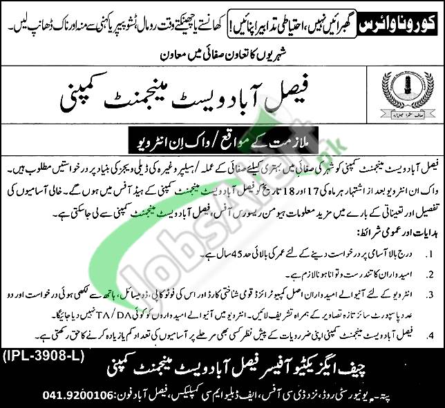 Applications are invited for the Latest Faisalabad Waste Management Company Jobs (Waste Worker / Helper). Appointment of these numerous Government Jobs in FSD will be based on a daily wage which can be on contract or permanent as per the policy of Faisalabad Waste Management. Candidates from Faisalabad City who want to apply should possess minimum Matric / Middle / Primary qualifications with good physical condition to apply. The age of the candidate should be a maximum of 30 years.