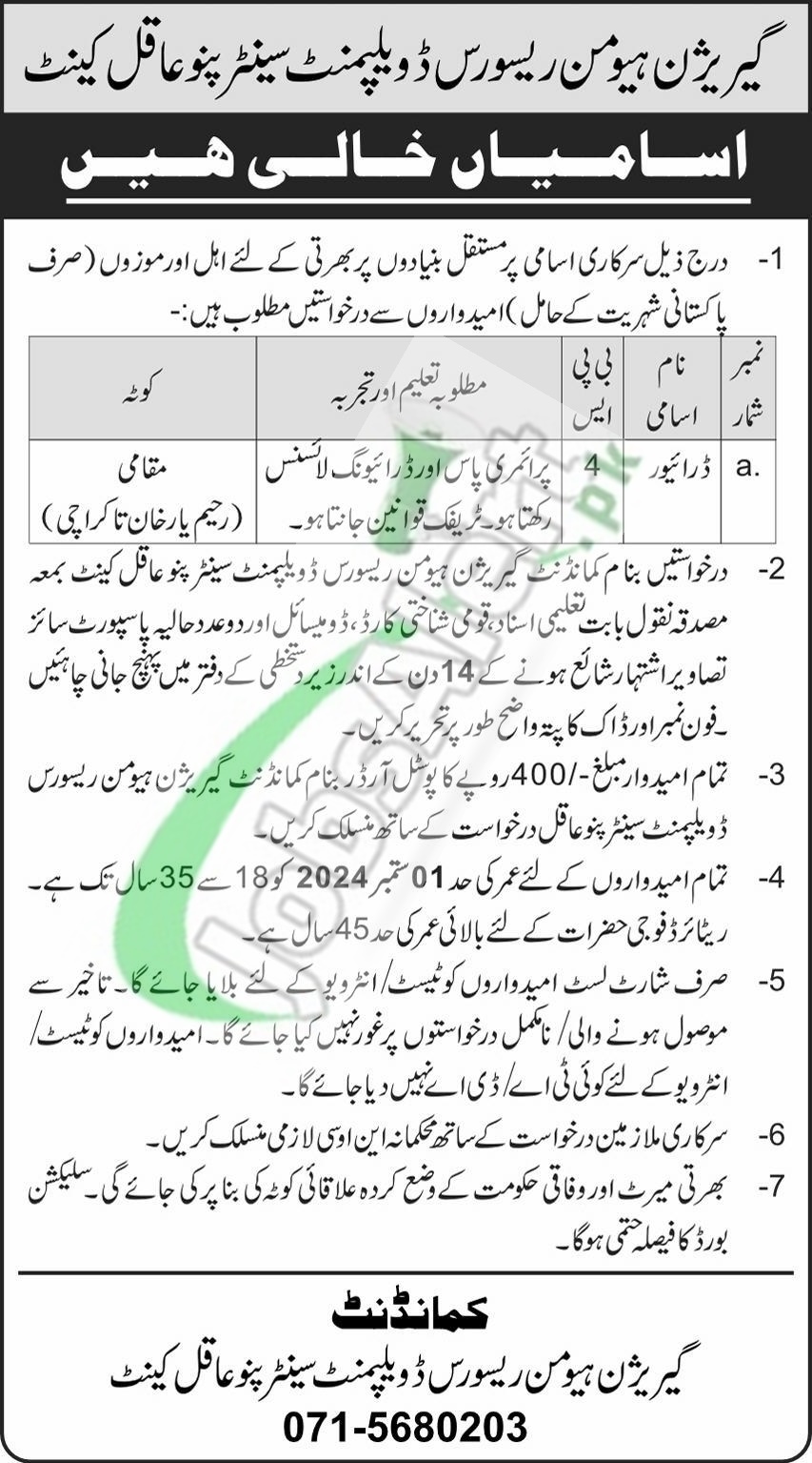 In the following, you will have Garrison Human Resource Development Centre Pano Aqil Jobs 2024 HRDC Latest. Applications are invited from the well-disciplined, expert and adroit applicants are currently required and the advertisement is from Garrison Human Resource Development Centre Pano Aqil Cantt hires such applicants for the following positions which include (Driver (BPS-04)) are the vacancies that need to be filled by those applicants only who possess the interest and are able to fulfill the needs of such positions.