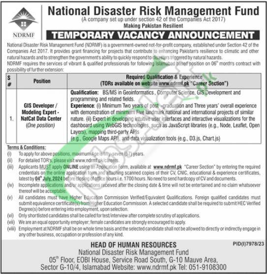NDRMF Jobs 2024 National Disaster Risk Management Fund Islamabad