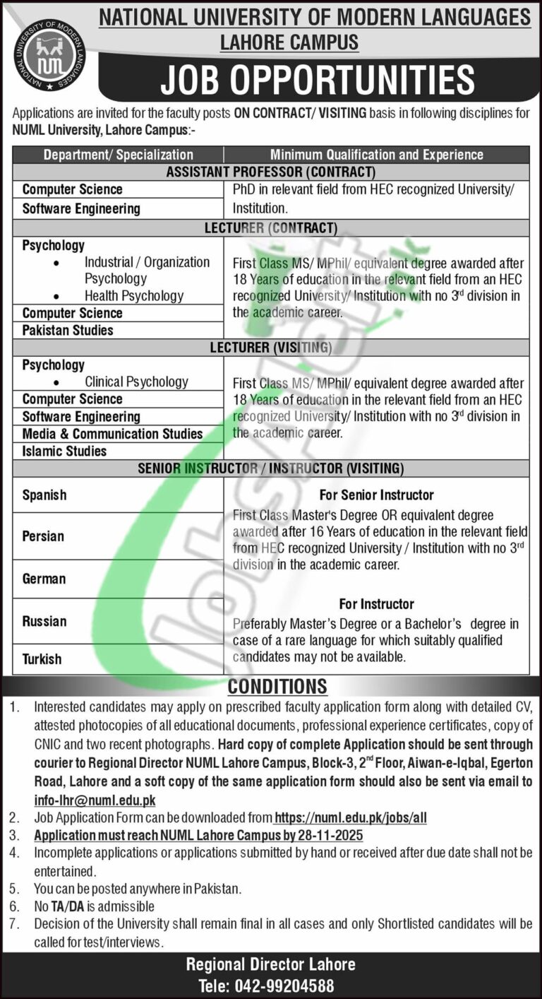The National University of Modern Languages NUML Lahore Jobs 2025 have been announced for the Lahore Campus, and it is inviting qualified professionals to join as faculty and instructors. These positions offer an excellent opportunity to work in a reputed academic institution and contribute to higher education in Pakistan. Selected candidates will be posted at the Lahore Campus, but may also serve at other NUML campuses across the country, depending on organizational requirements.