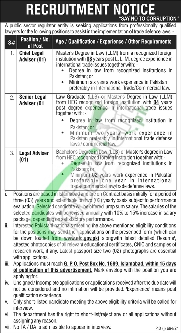 PO Box 1689 Jobs carries vacancies named as (Chief Legal Adviser, Senior Legal Adviser, Legal Adviser). All these employment opportunities are going to recruit on a contractual basis initially for two years which is extendable as per the recruitment policy of the Government of Pakistan.