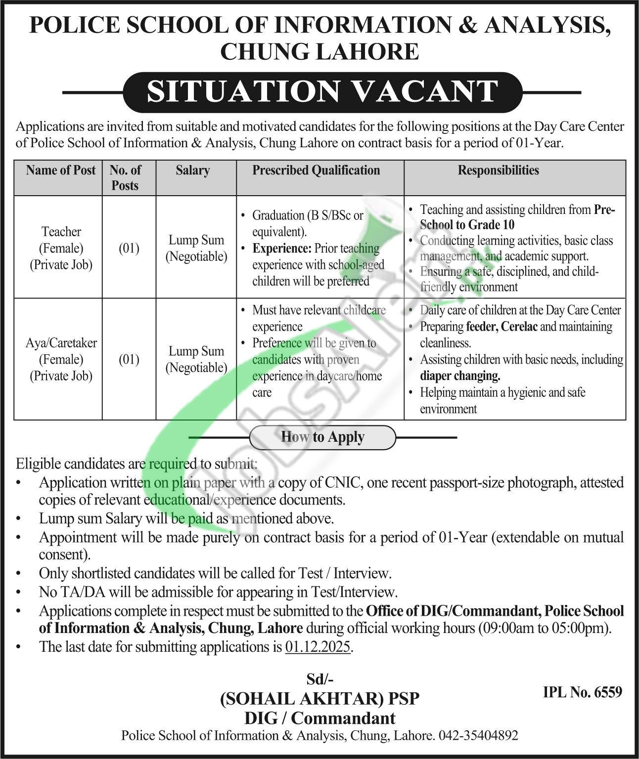 Interviews will be conducted only with the shortlisted candidates, and the selection will be on a merit basis. The jobs have lump salaries that can be negotiated and a protective, hygienic, and kid-friendly working environment. The written application should be sent to the office of DIG/Commandant, Police School of Information and Analysis, Lahore, together with all the necessary documents.
