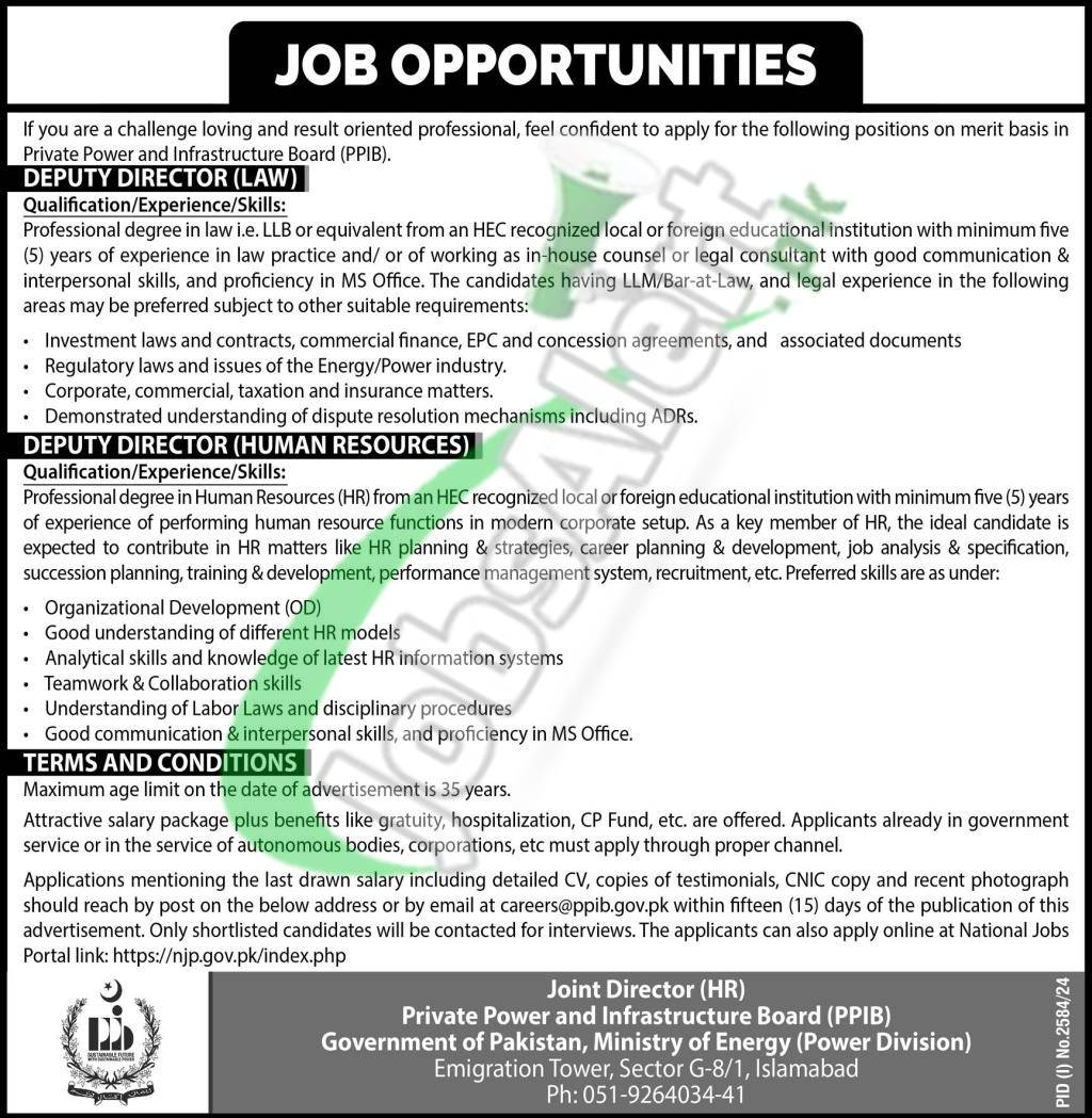 Jobs in Private Power Infrastructure Board named (Deputy Director (Law), Deputy Director (Human Resources)) are the government jobs that need to be filled with the overall qualification of LLB / LLM / Masters from a university recognized by the Higher Education Commission with at least five years relevant experience are needed to apply for such posts.