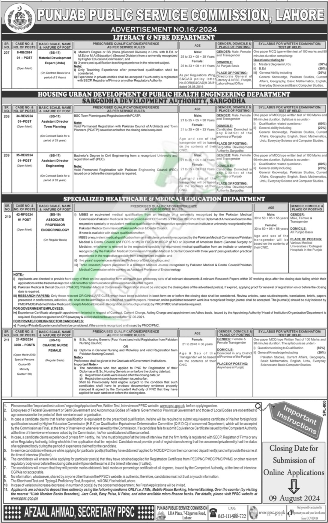 For the above-mentioned departments services of such suitable applicants are needed to apply for the overall following posts as (Material Development Expert (Urdu), Assistant Director Town Planning, Assistant Director Engineering, Associate Professor Endocrinology, Charge Nurse Female) and complete of vacancies can be examined from the following job advertisement.