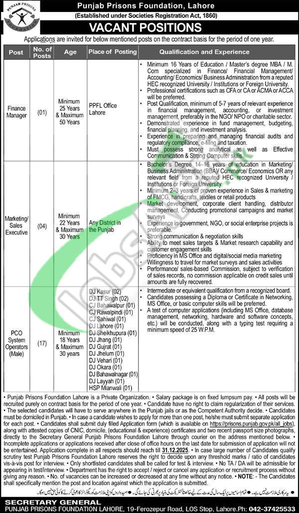 Jobs in Punjab Prisons Foundation named (Finance Manager, Marketing / Sales Executive, PCO System Operations (Male)) is vacant for all the Punjab Jails this vacancy is vacant to apply for and one can meet all the needs and then come forward to apply, As, the post is before your eyes to be viewed now its eligibility criteria which are required for this post includes Master’s / MBA / CFA / CA / ACMA / ACCA / Bachelor’s / Intermediate with relevant experience needed to apply.