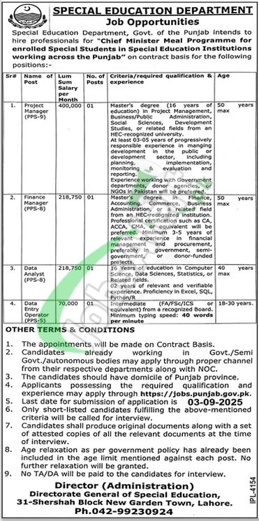 Jobs in Special Education Department Punjab such as (Project Manager (PPS-09), Finance Manager (PPS-08), Data Analyst (PPS-08), Data Entry Operator (PPS-05)) are the posts based at project titled “Chief Minister Meal Programme for enrolled Special Students in Special Education Institutions working across the Punjab” and these positions need to be filled by the applicants holding Punjab Domicile. If you are from another province then we suggest you check ASF Jobs ready to apply.