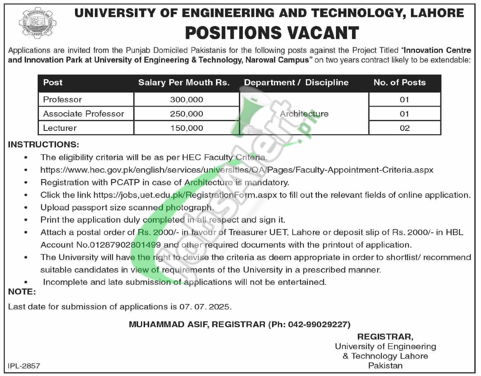 - Online application is available at https://jobs.uet.edu.pk/RegistrationForm.aspx.