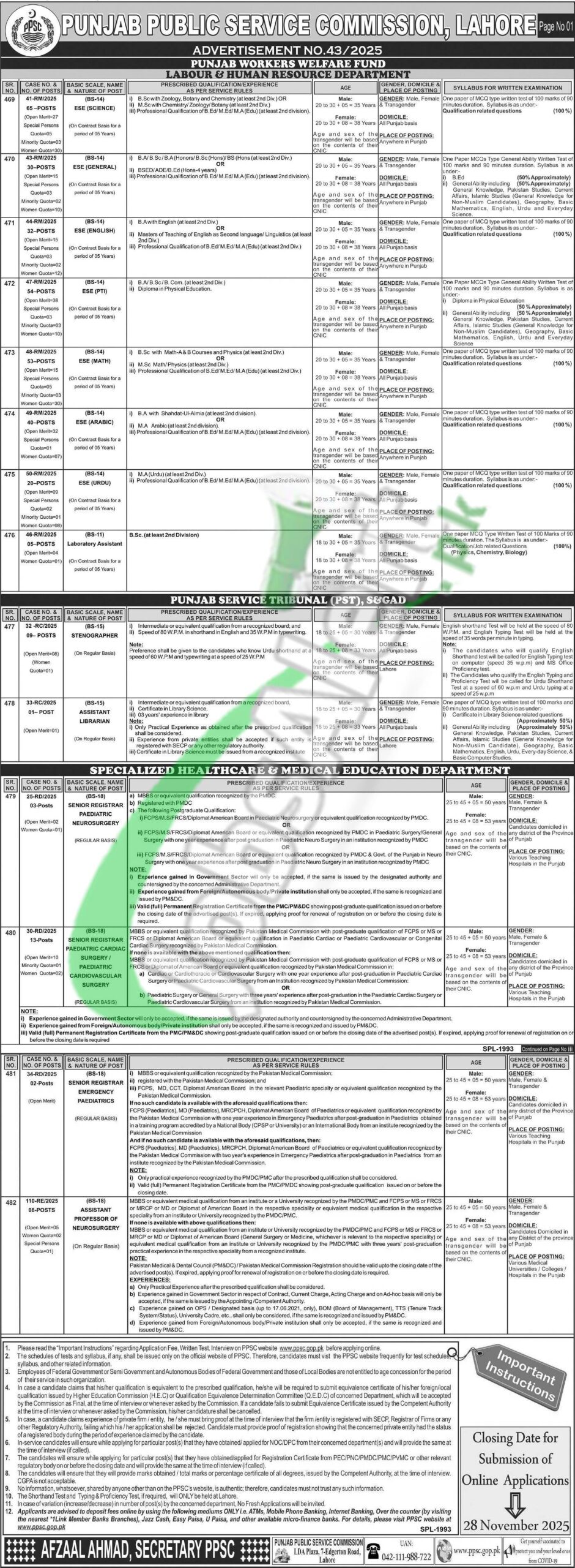 Advertisement is published at www.ppsc.gop.pk and in multiple newspapers, i.e., Jang Newspaper, and can be checked from this page. According to the current announcement, Advertisement 43/2025 is announced today, according to which numerous vacancies are announced in (Punjab Workers Welfare Fund (ESE (Science), ESE (General), ESE (English), ESE (PTI), ESE (Math), ESE (Arabic), ESE (Urdu), Laboratory Assistant), Punjab Service Tribunal (Stenographer, Assistant Librarian), Specialized Healthcare & Medical Education Department (Senior Registrar Paediatric Neurosurgery, Senior Registrar Paediatric Cardiac Surgery / Paediatric Cardiovascular Surgery, Senior Registrar Emergency Paediatrics, Assistant Professor of Neurosurgery)). The above vacancies are from multiple government sectors, but if you are interested in the education sector, then check STI jobs, ready to apply now.